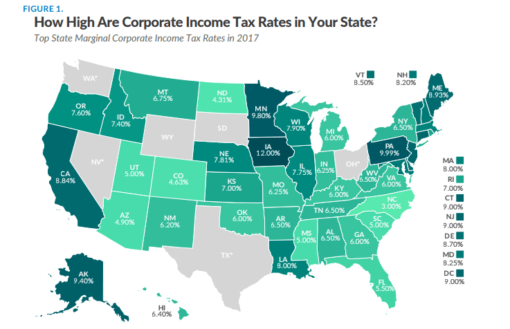 44個(gè)州征收企業(yè)所得稅。稅率從北卡羅萊納州的3%到愛(ài)荷華州的12%。