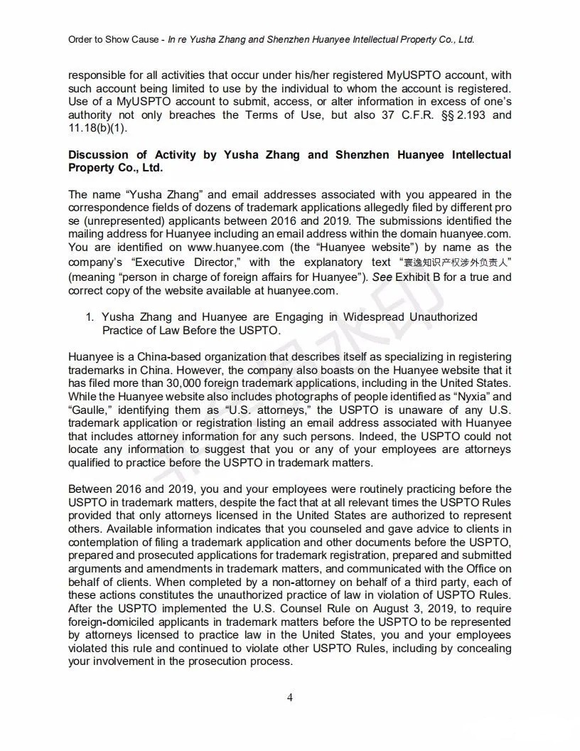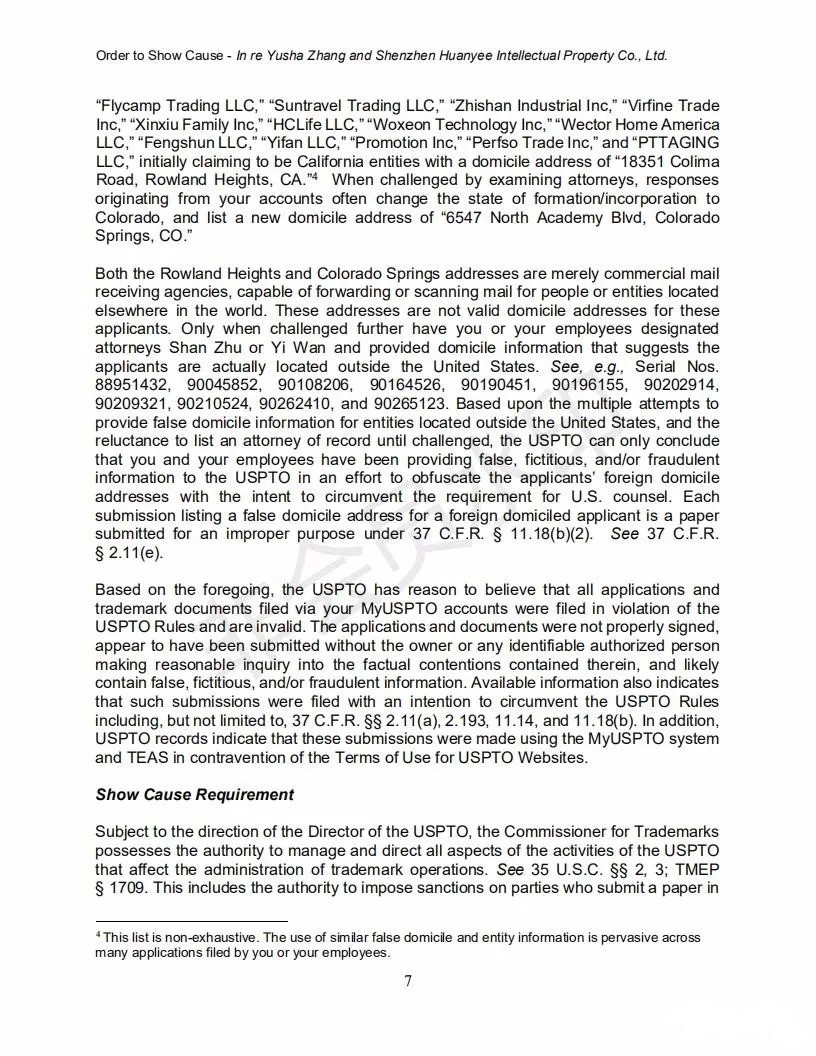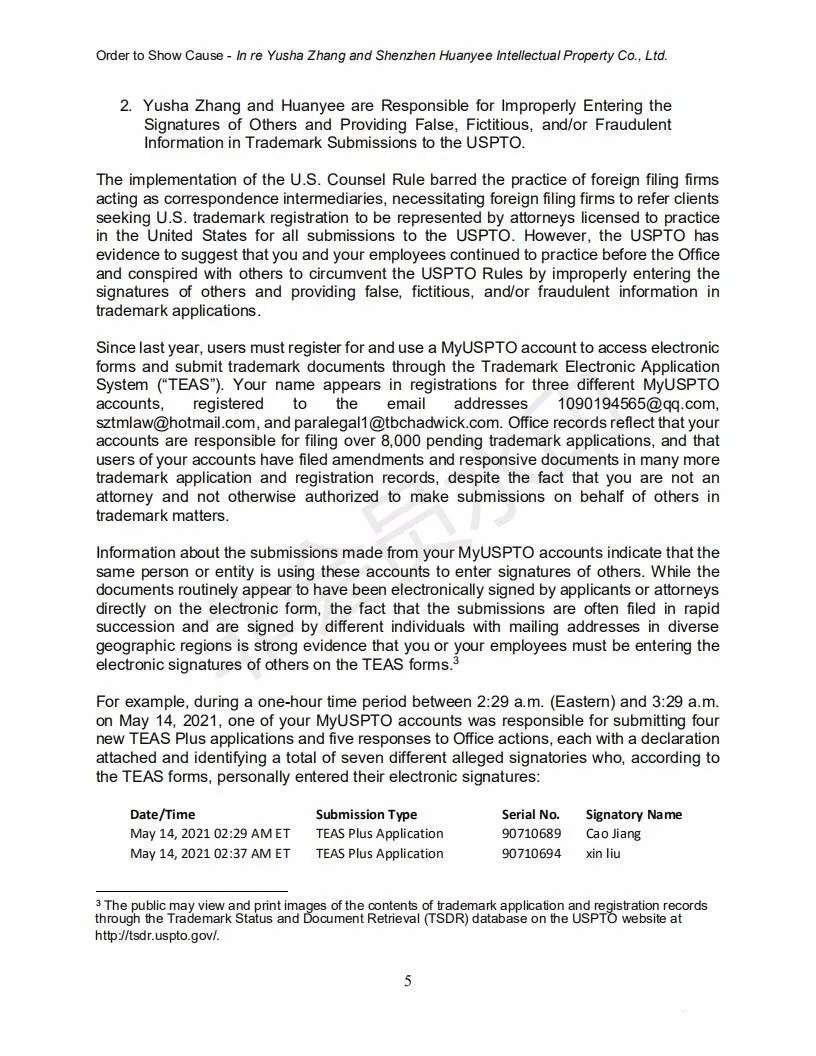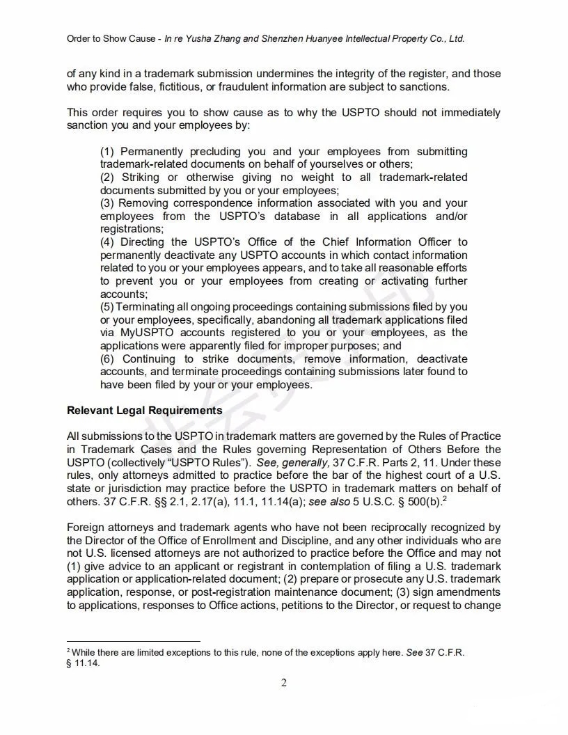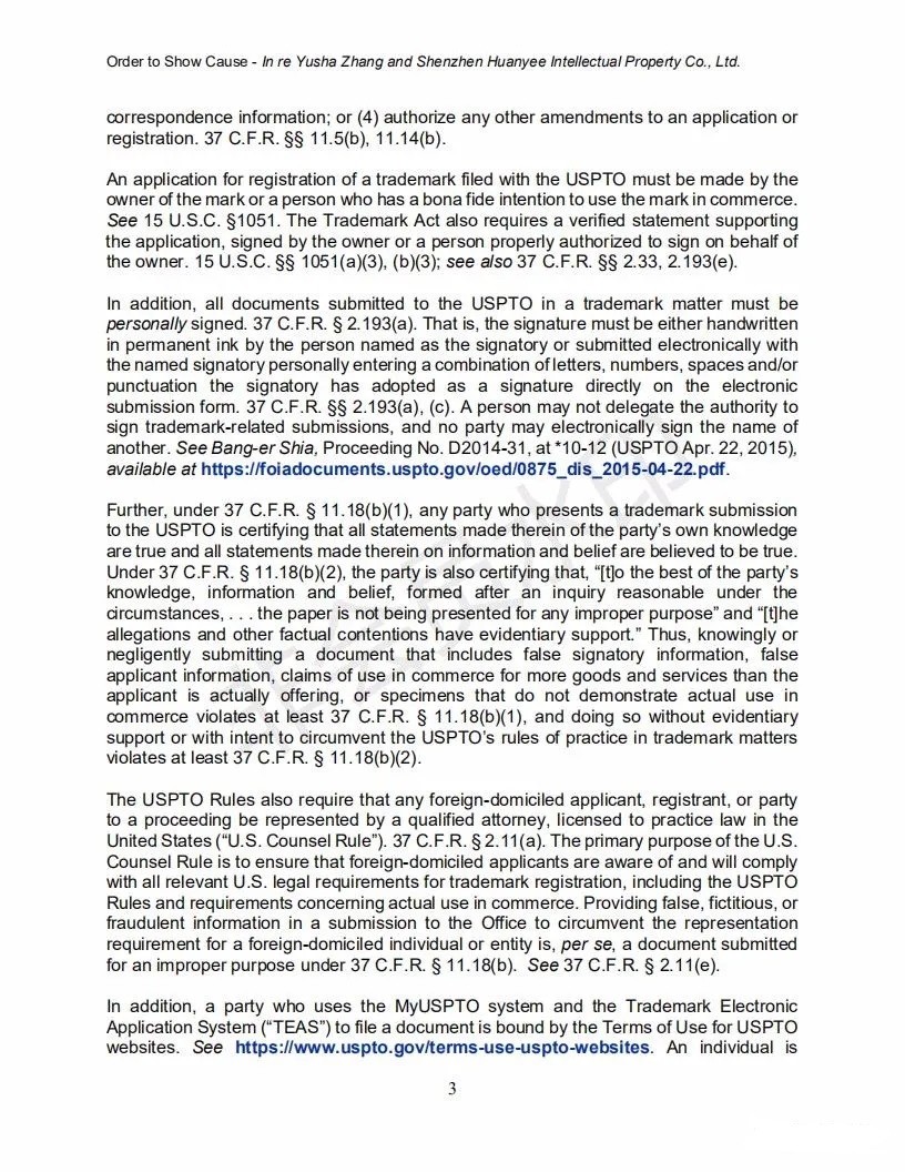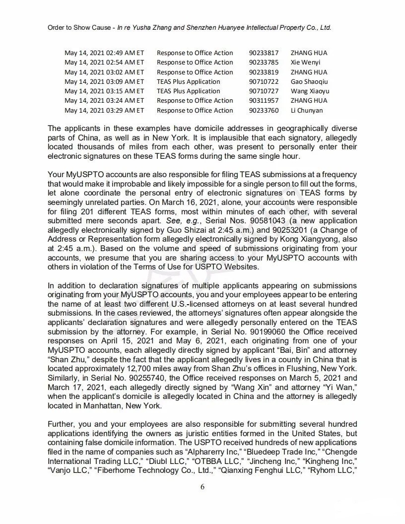 2021年6月8日,美國專利商標局(USPTO)向中國深圳一家知識產權公司的代表人發(fā)出一份123頁的“ORDER TO SHOW CAUSE”。對該公司代理提交的批量美國商標的行為,尤其是其中涉及到第三方簽名提供虛假、虛構和欺詐信息的行為提出質疑,要求該公司提出合理的理由,并在美國東部時間6月22日下午5:00前進行回復。否則USPTO將會對該代理機構以及代表人進行制裁。